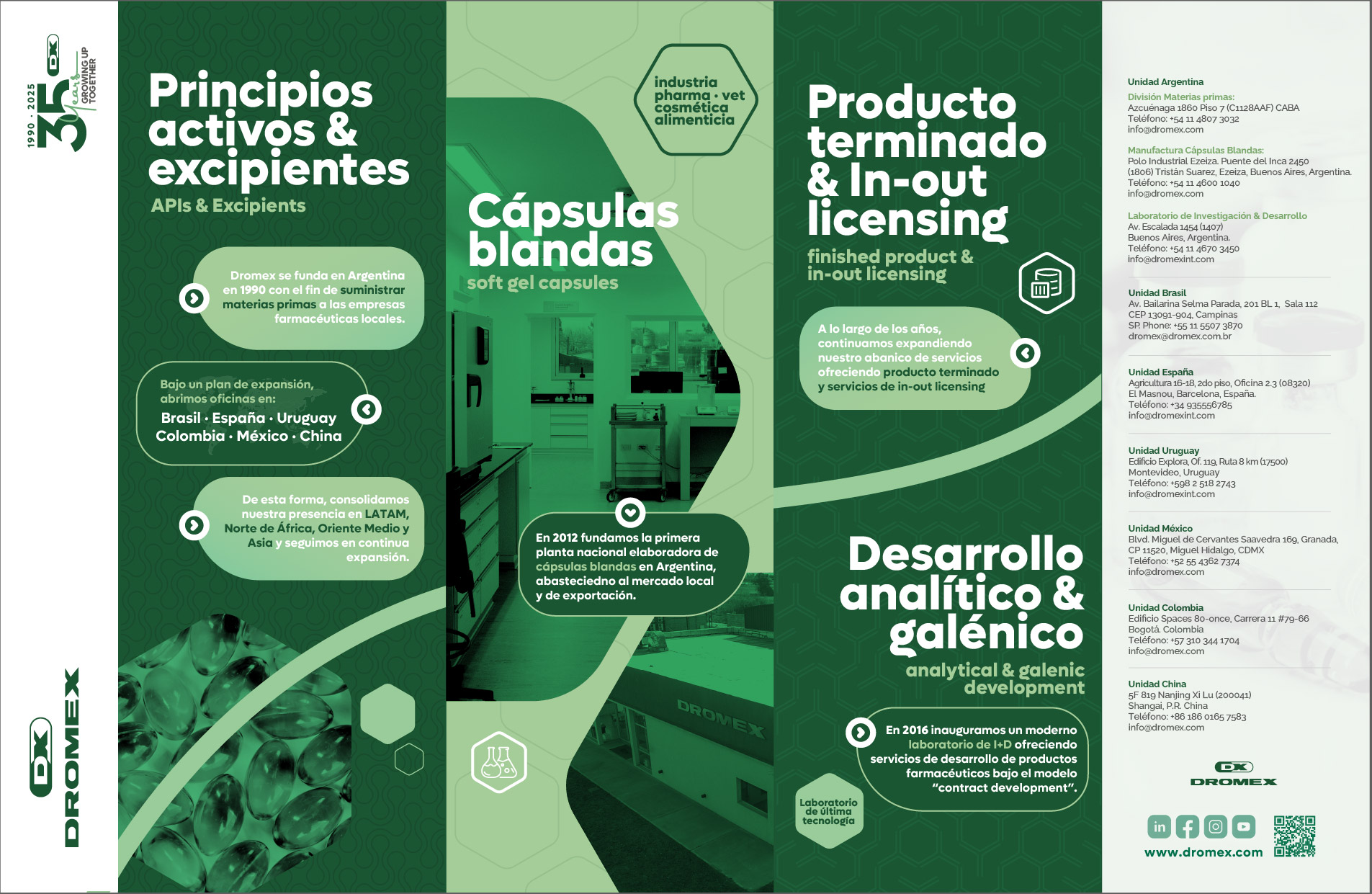 Como complemento a sus servicios, Dromex cuenta con una planta de tercerismo de cápsulas de gelatina blanda y un laboratorio de desarrollo galénico/analítico, ubicados en Buenos Aires, Argentina.